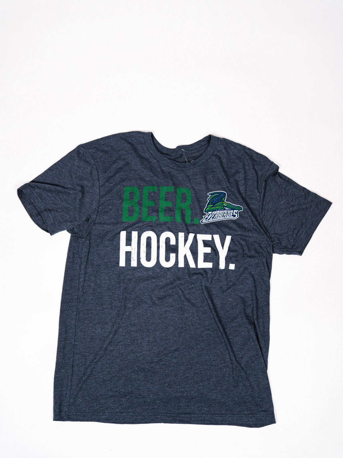 Sometimes simple is best and the short-sleeve Everblades "Beer, Hockey" T- Shirt is the best example of simple yet casual. This shirt is loose fitting, a dark gray color and includes on the upper right chest the fierce Everblades symbol.
