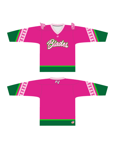 This is a FULLY SUBLIMATED replica jersey of the 2026 Pink In the Rink Night Jersey that the Everblades will be wearing on the ice.