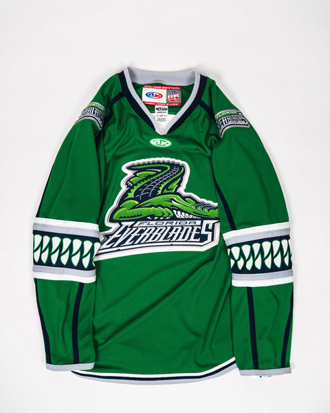 Become the ultimate Everblades hockey fan with the "Everblades Kelly Green Replica Jersey"- made to make you feel like a part of the championship winning team. This breathable jersey has a strong green appearance and is loose fit.